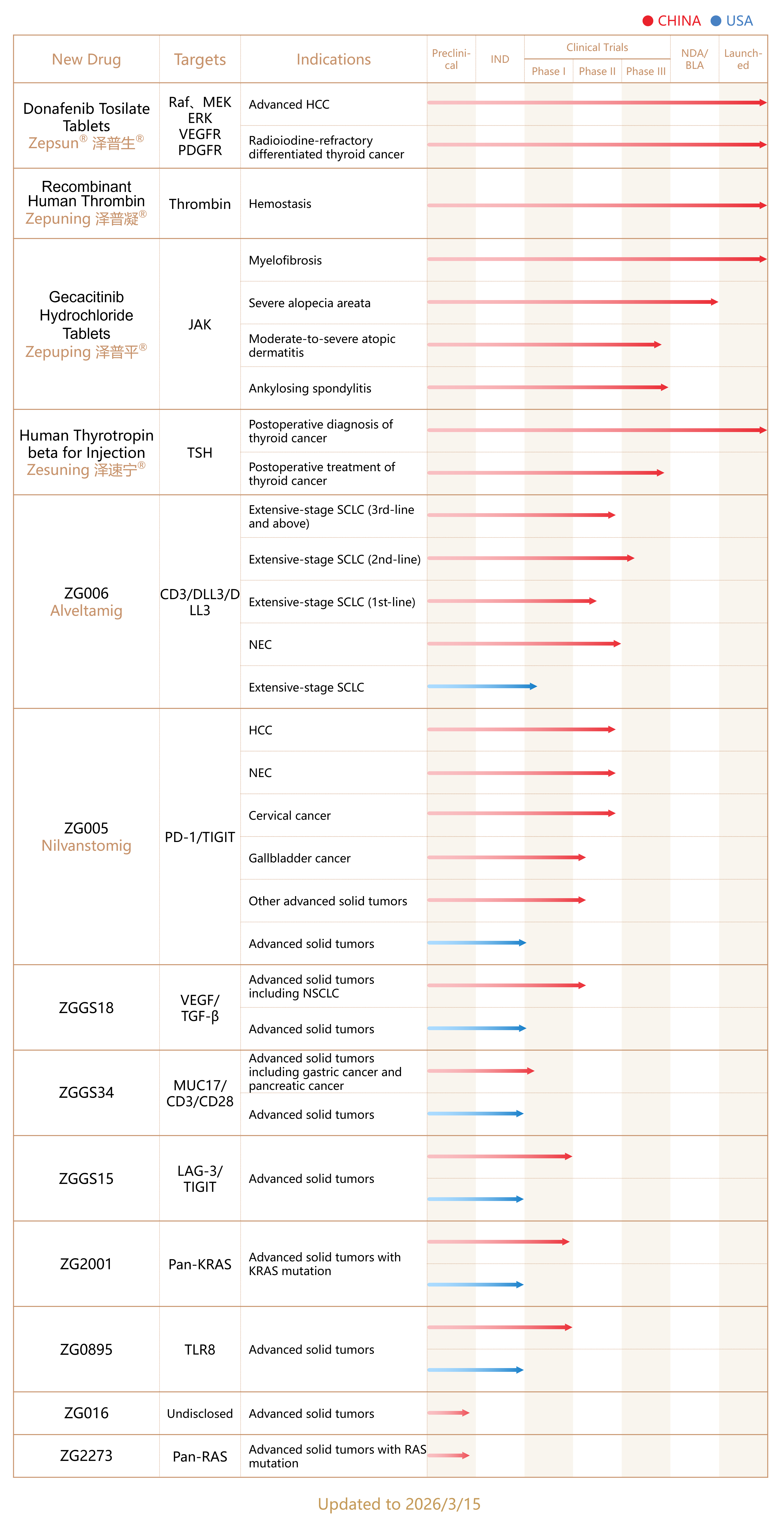 We have four marketed drugs: Zepsun® (Donafenib Tosilate Tablets), China's first domestically developed small molecule multi-target drug for the first-line treatment of advanced hepatocellular carcinoma; Zepuping® (Gecacitinib Hydrochloride Tablets), China's first domestically developed innovative JAK inhibitor for the treatment of myelofibrosis; Zepuning® (Recombinant Human Thrombin), the only recombinant human thrombin in China successfully commercialized using recombinant DNA technology; and Zesuning® (Human Thyrotropin Beta for Injection), China's first approved innovative product for postoperative precise assessment of differentiated thyroid cancer, used as a diagnostic drug for radioactive iodine whole-body scanning and serum thyroglobulin testing during postoperative follow-up for patients with differentiated thyroid cancer.